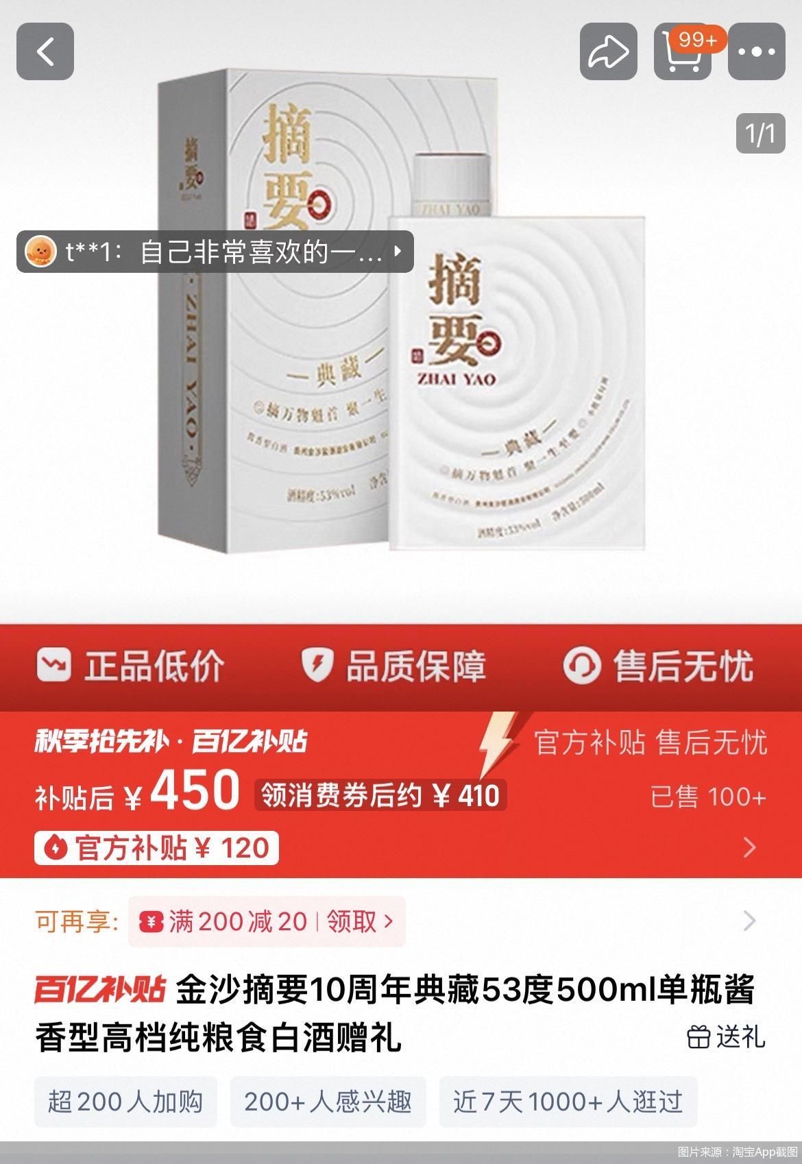西直门附近的烟酒店中,53度500ml金沙摘要(珍品)成交价为488元/瓶。而在饿了么平台中,该产品在京东酒世界内成交价再度下探达460元/瓶。不仅如此,电商平台也同样出现价格大幅下滑的情况。在淘宝App上,北京商报记者搜索“金沙摘要酒”发现,在百亿补贴之下,53度500ml金沙摘要(珍品)售价450元/瓶,成交价再次被拉低。