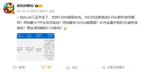 数码博主“数码闲聊站”表示,一加Ace 6已三证齐全,意味着符合上市条件,只差一个发布会就能上市发售。